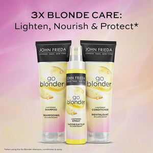 • English: 3 x Blonde care: lighten, nourish & protect *when using the Go blonder shampoo, conditioner & spray Français: Triple soin pour cheveux blonds : éclaircit, nourrit et protège *avec l’utilisation du shampooing, du revitalisant et du vaporisateur Go Blonder