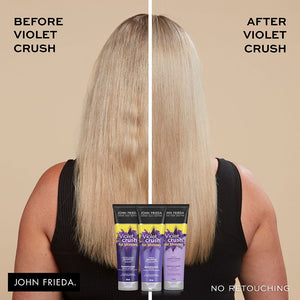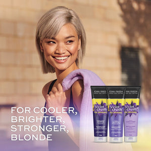 - Pour des cheveux blonds éclatants dignes d’un salon, il suffit d’utiliser le revitalisant mauve Violet Crush for blondes de John Frieda