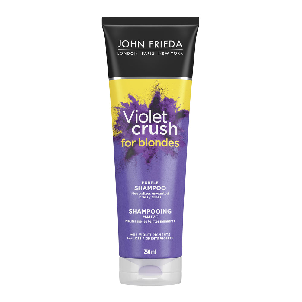 Our Violet Crush® Purple Shampoo for Blondes with crushed violet pigments crushes brassy tones for cooler, brighter blonde in one use. With crushed violet pigments, this rich formula instantly transforms even the most stubborn brassy yellow and orange tones into cooler, brighter blonde. Safe for use on natural, colour-treated, and platinum blonde. Cruelty-free, SLS/SLES sulfate-free, peroxide-free, ammonia-free, and free of parabens and phthalates.